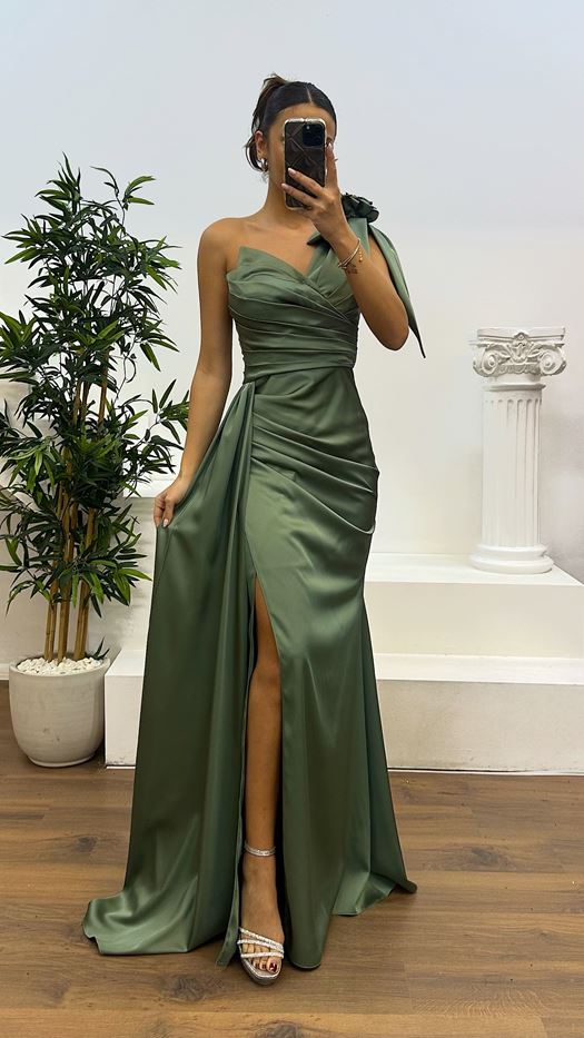 One Shoulder Floral Detail Satin Evening Dress