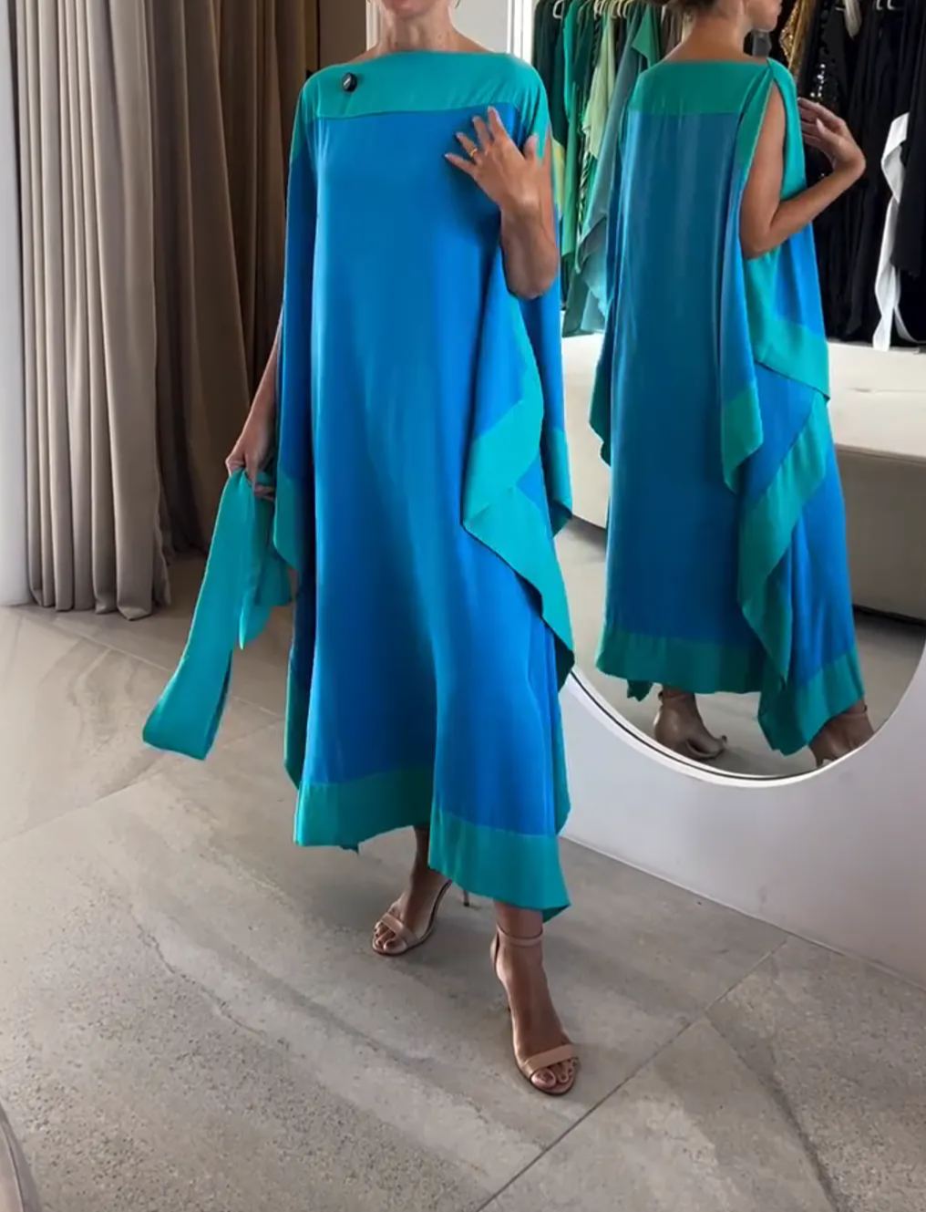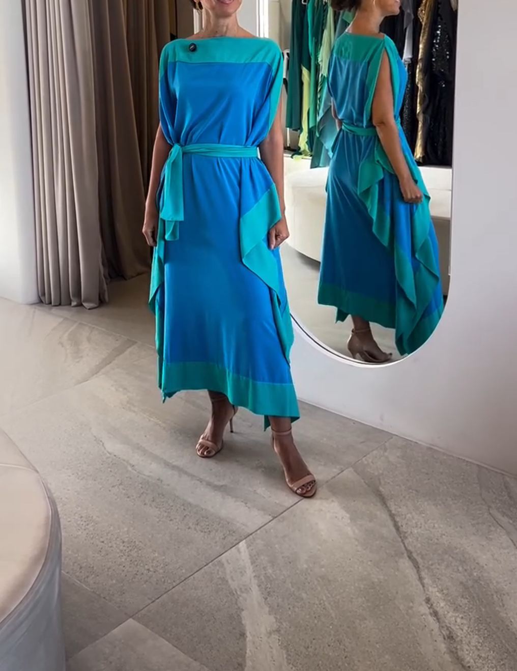 Elegant Colorblock Draped Midi Dress in Ocean Blue & Teal