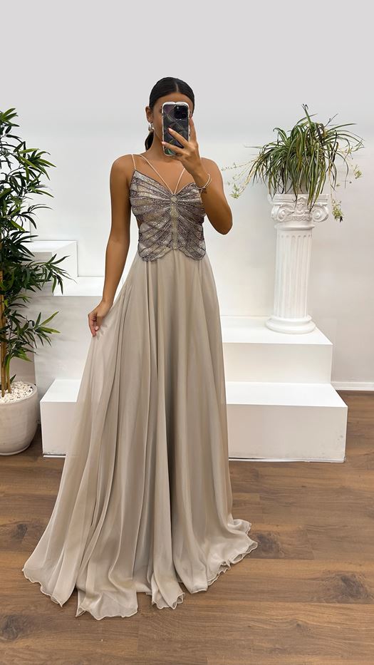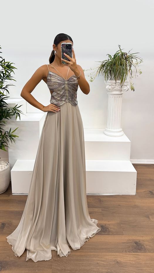 Evening Dress with Stone Rope Strap and Embroidered Back Detail