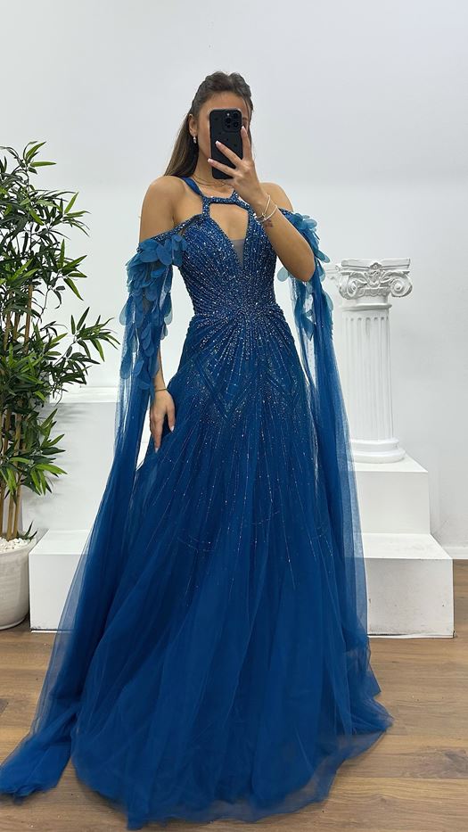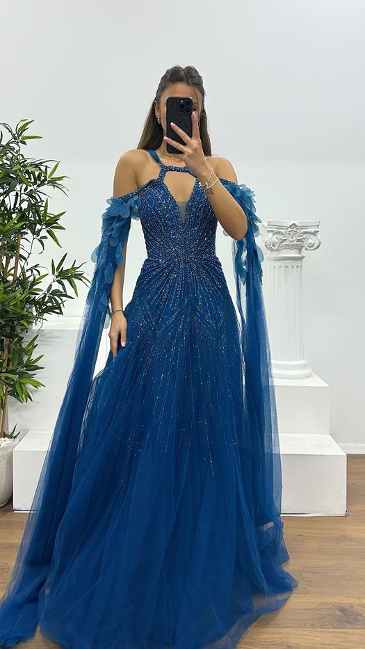 Petrol Tulle Special Design Evening Dress