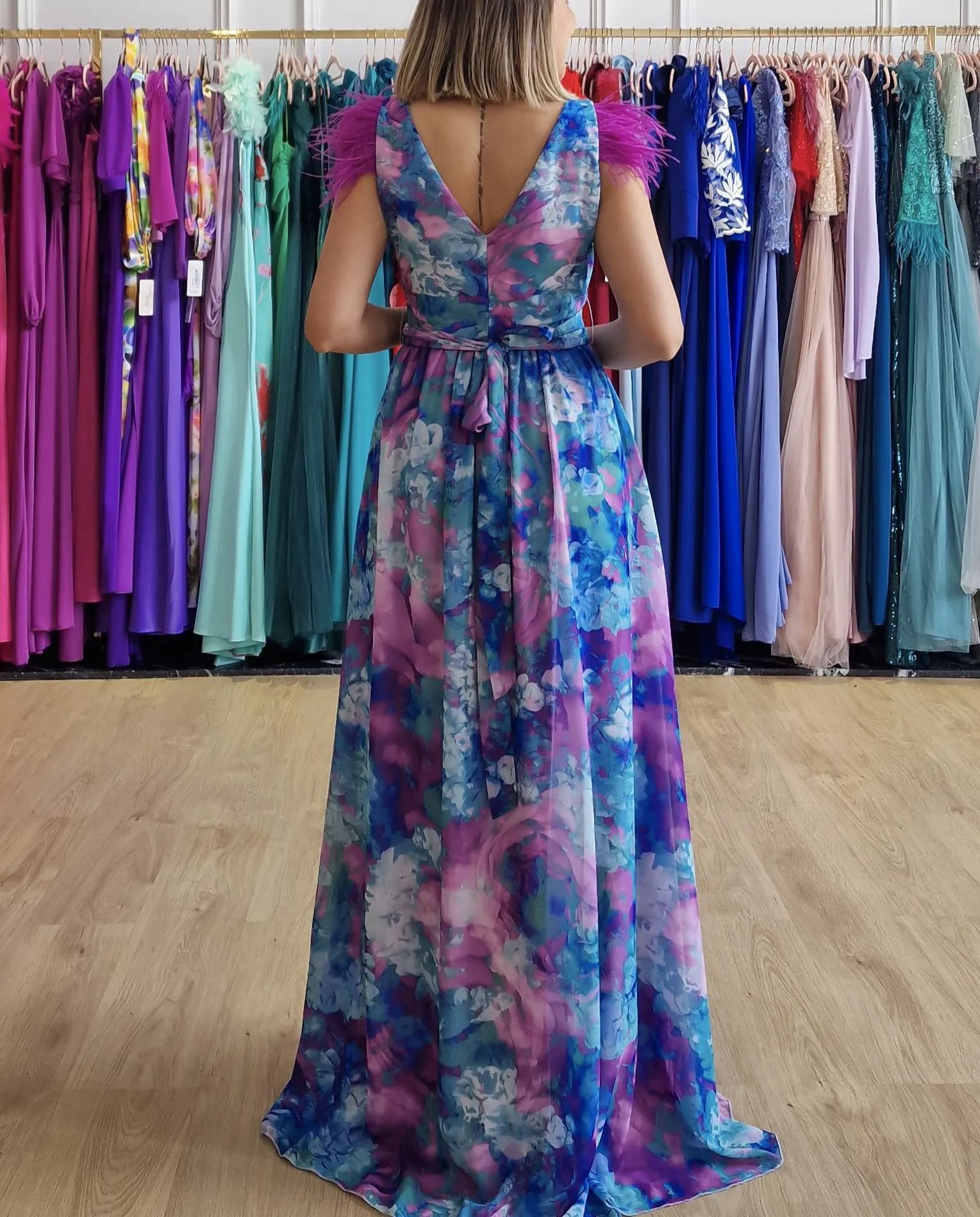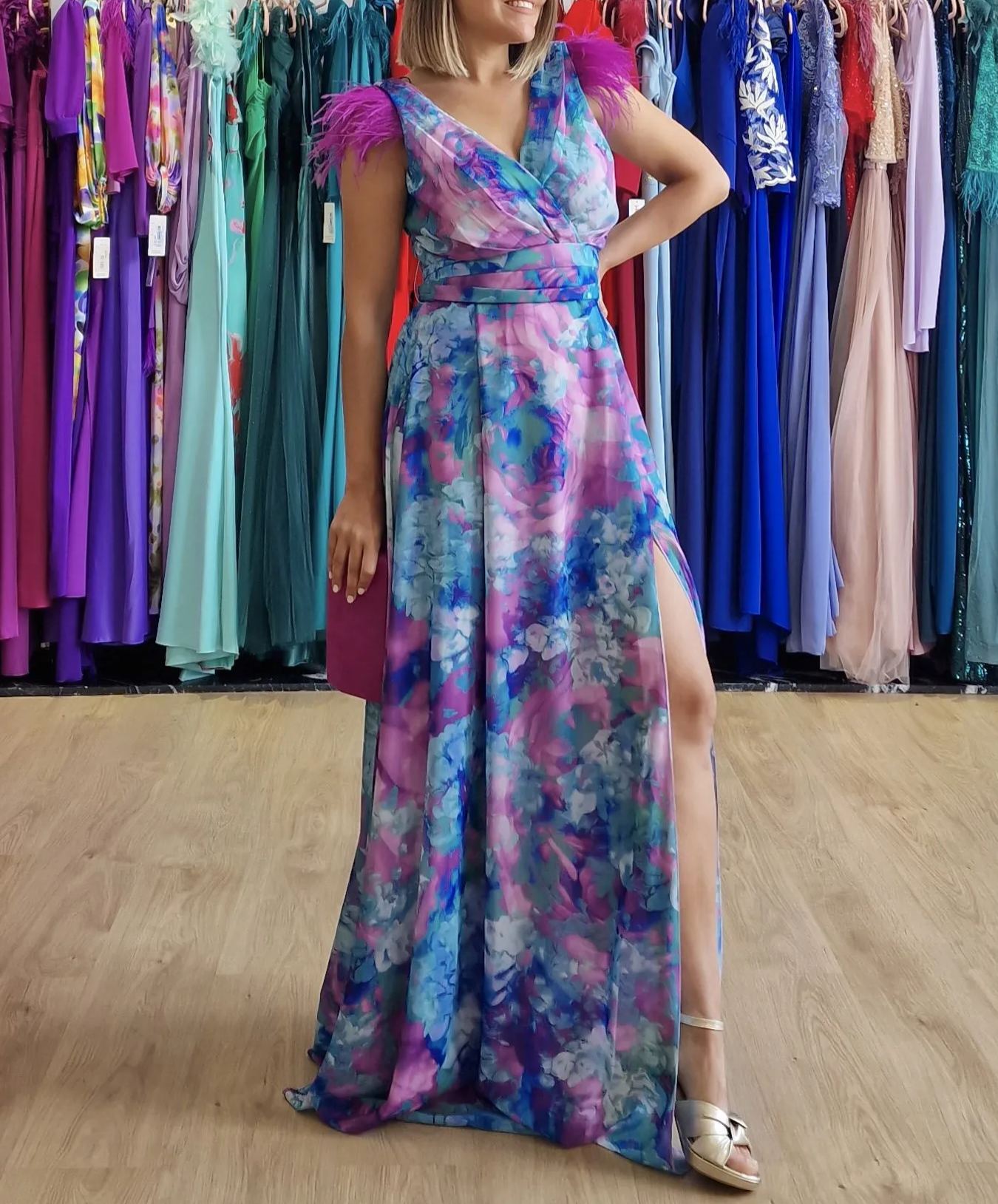Elegant Burgundy Evening Gown with Floral Waist Detail