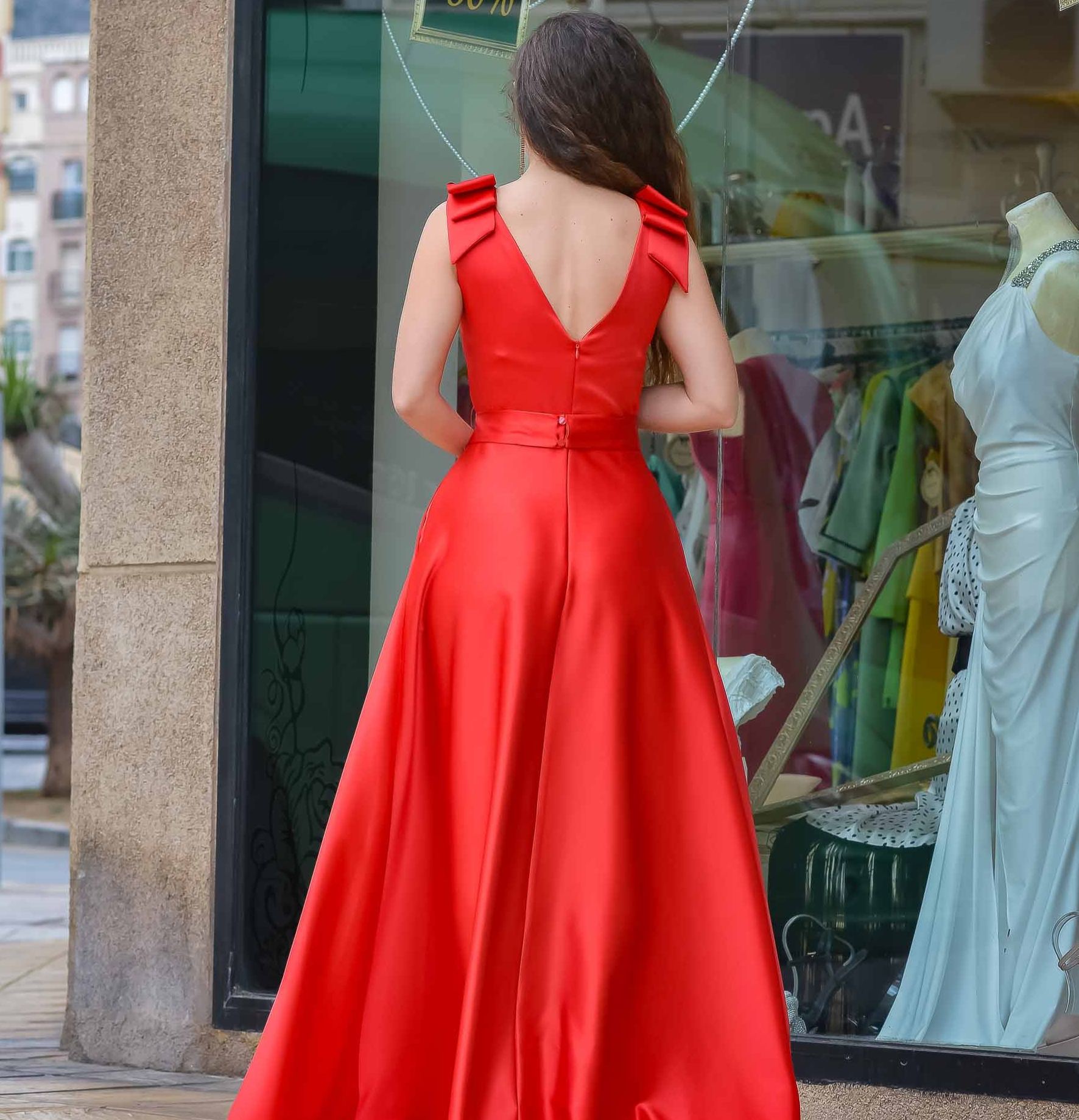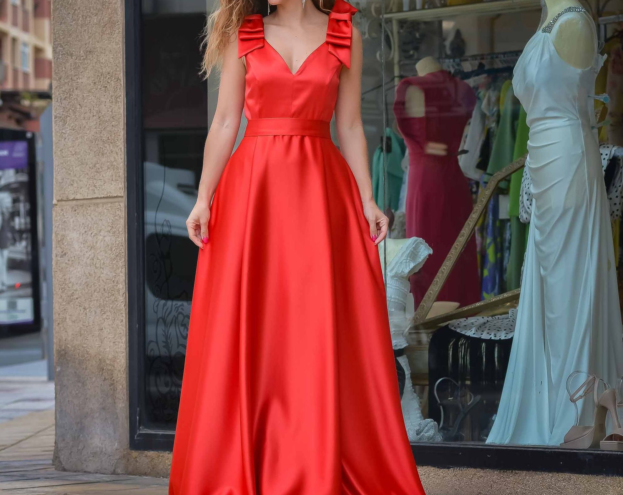 Satin Elegance Ruffle-Shoulder Evening Gown