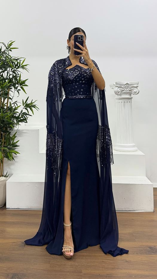 The sequined embroidered cape is paired with a slim skirt, and the tassel decoration makes it agile and elegant when walking, adding a gorgeous aura; the tube top design reveals delicate shoulders and neck, the high slit skirt shows long legs, the navy blue tone is calm and advanced, and the sequins shine and attract attention.