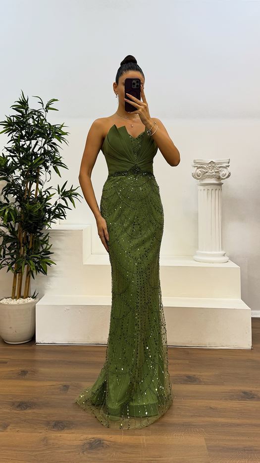 The tube top design is matched with three-dimensional pleats, outlining the charming shoulder and neck lines, adding a sense of fashion; the skirt is full of sequins that shine and attract attention, like starlight, the fishtail skirt fits the body, and the dark green tone is calm and atmospheric, highlighting the graceful curves.