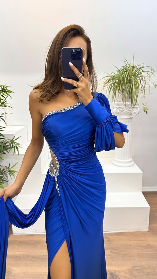 One Shoulder Waist Stone Detail Evening Dress