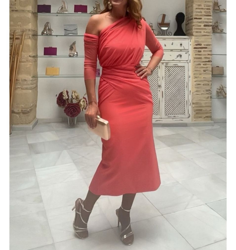Coral One-Shoulder Midi Dress