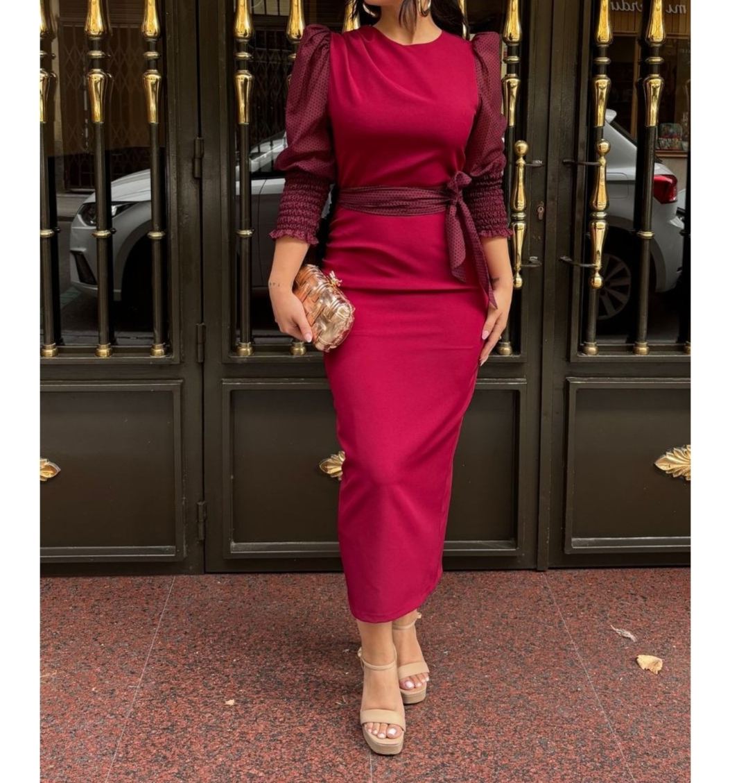 Midi Dress with Sheer 3/4 Sleeves & V-Neck Ruched Bodice