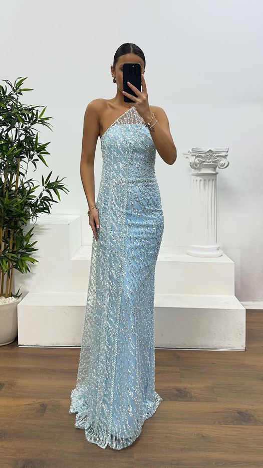 Lavender One Shoulder Rose Detail Evening Dress
