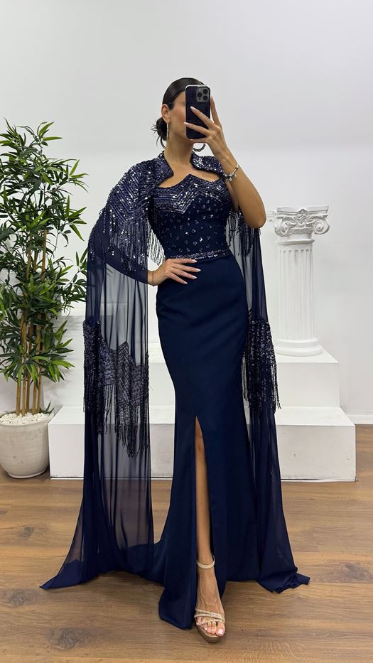 Beige Embroidered Special Design Evening Dress
